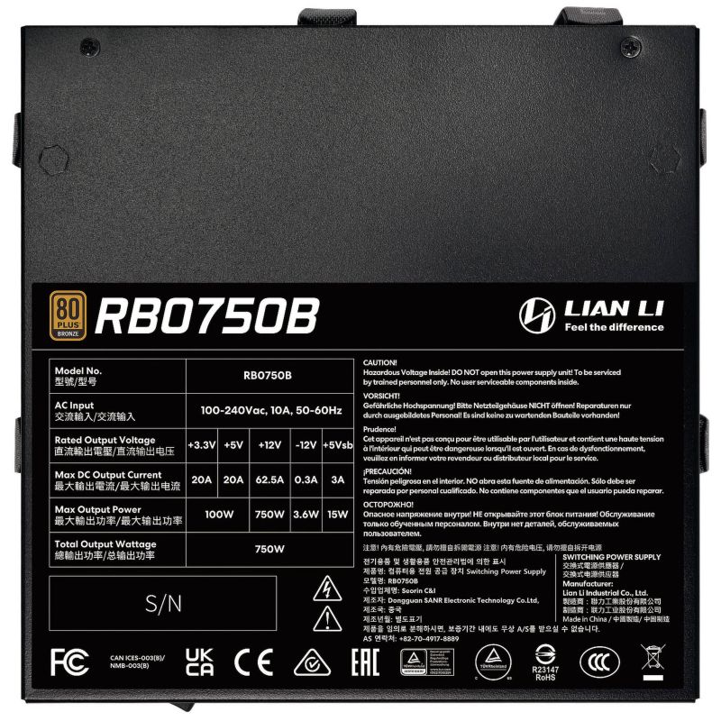 L' alimentation Lian Li RB Series 750W répond aux normes ATX 3.1 et PCIe 5.1 , offrant ainsi des spécifications modernes en matière d'efficacité, de sécurité et de stabilité – idéale pour les générations de matériel actuelles et futures.