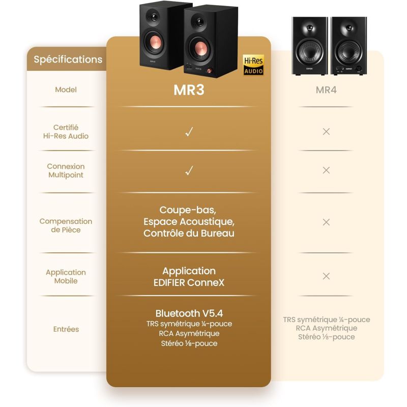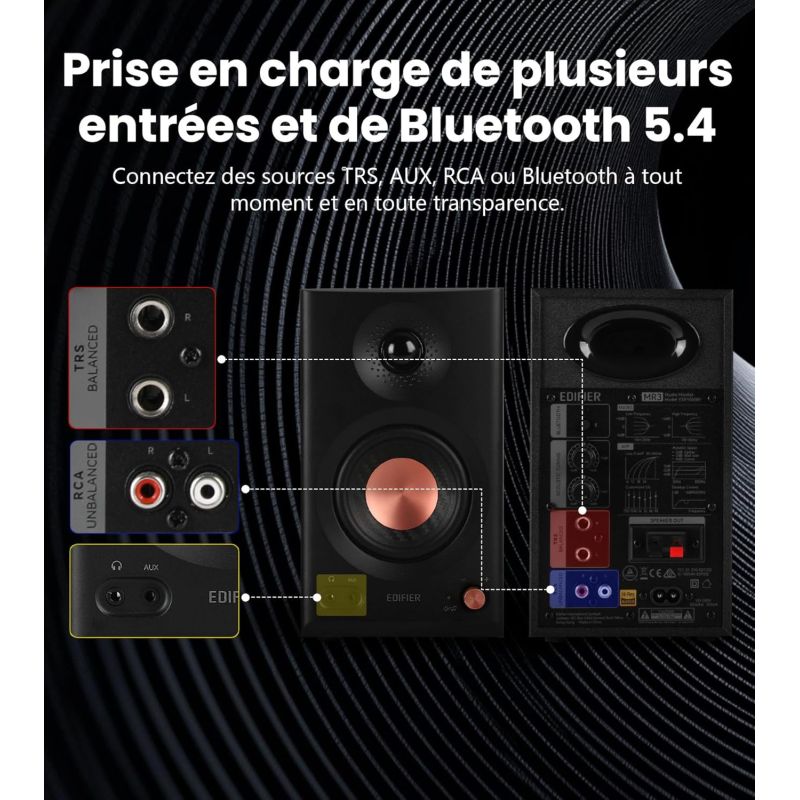 - Hi-Res Audio, Bluetooth V5.4, Contrôles physiques, RCA, AUX, Application Mobile, 2x18W