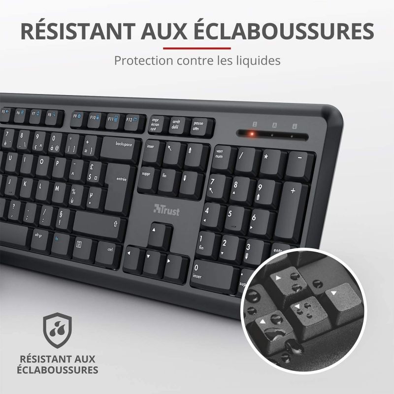 Gardez votre bureau bien rangé et sans encombrement de câbles. Le Trust Ymo est sans fil et doté d’un microrécepteur USB unique qui fonctionne avec le clavier et la souris. Une fois votre travail terminé, rangez tout simplement le récepteur dans la souris. Ainsi saurez-vous toujours où le trouver. Le clavier YMO est également résistant aux déversements. Alors pas de souci s’il vous arrivait de renverser du café, votre clavier vous laissera poursuivre votre travail.