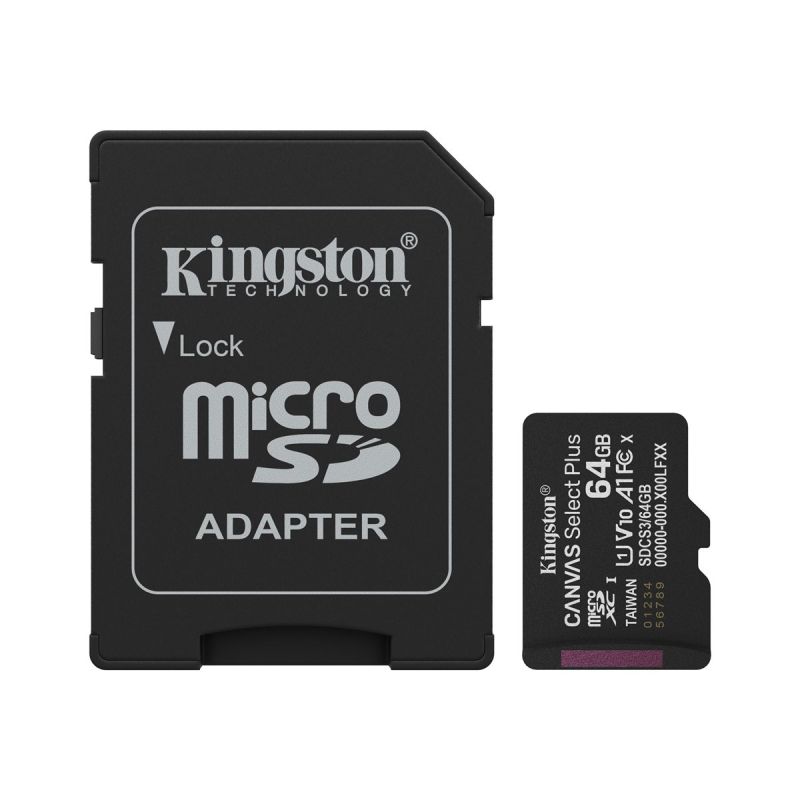 Description:Kingston Canvas Select Plus - Carte mémoire flash (adaptateur microSDXC vers SD inclus(e)) - 64 Go - A1 / Video Class V10 / UHS-I U1 / Class10 - microSDXC UHS-I
