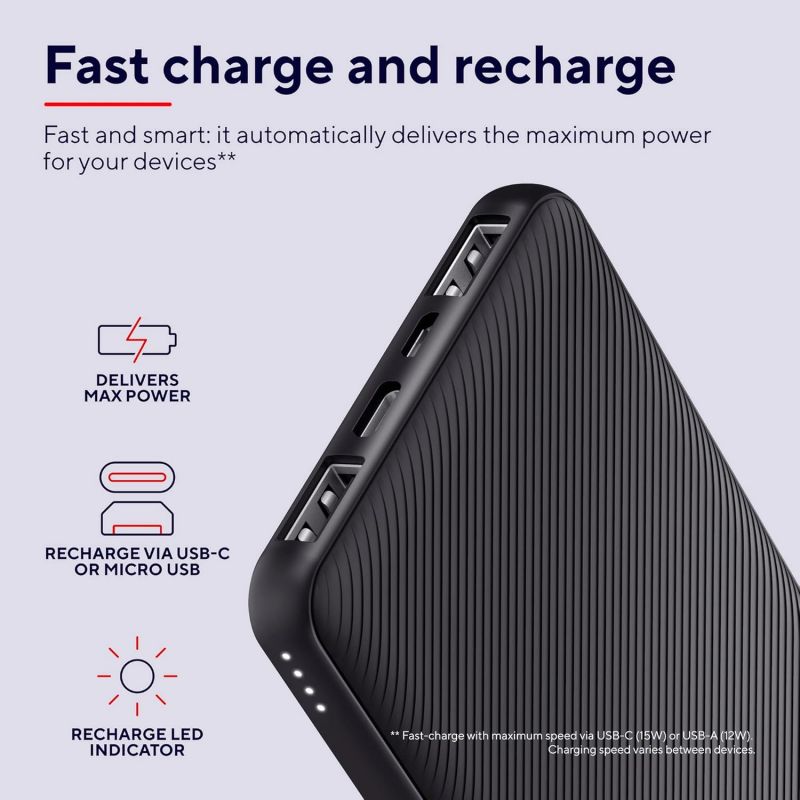Une conception ultra-mince et compacte vous permet d’emballer, de recharger et de partir – sans ajouter de poids ou de volume à votre transport quotidien, tandis que la capacité de charge rapide charge vos appareils à la vitesse maximale.** **Charge rapide avec vitesse maximale via USB-C (15W) ou USB-A (12W). La vitesse de charge varie d’un appareil à l’autre.