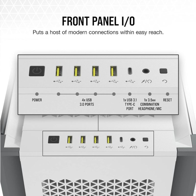 Panneau avant en maille, passages de câbles, panneau latéral en maille, compatible avec un radiateur de 120/140 mm à l'arrière, compatible avec un radiateur de 360/420 mm sur le panneau supérieur, compatible avec un radiateur de 420/480 mm sur le panneau avant, compatible avec un radiateur de 420/480 mm sur le côté gauche, panneau gauche en verre trempé, panneaux latéraux sans outil (verrouillage par simple pression)