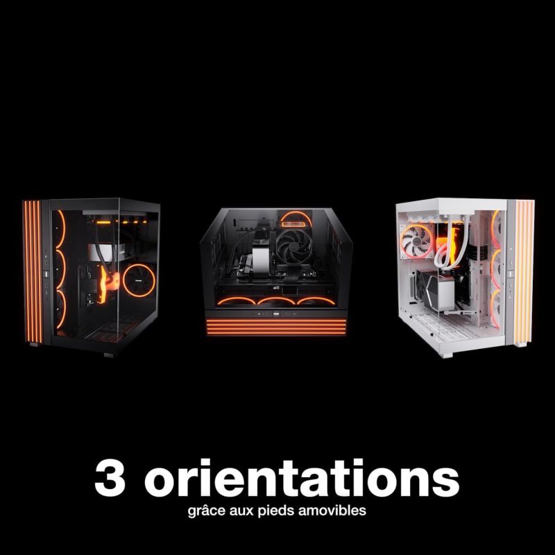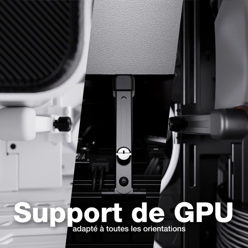 Le Light Base 900 DX Black est équipé d'un support VGA flexible et discret qui empêche l’affaissement de la carte graphique. Le meilleur dans tout ça ? Ce support fonctionne quelle que soit l’orientation de votre carte graphique, horizontale ou verticale. Résultat : un look épuré même avec des cartes graphiques imposantes et lourdes.