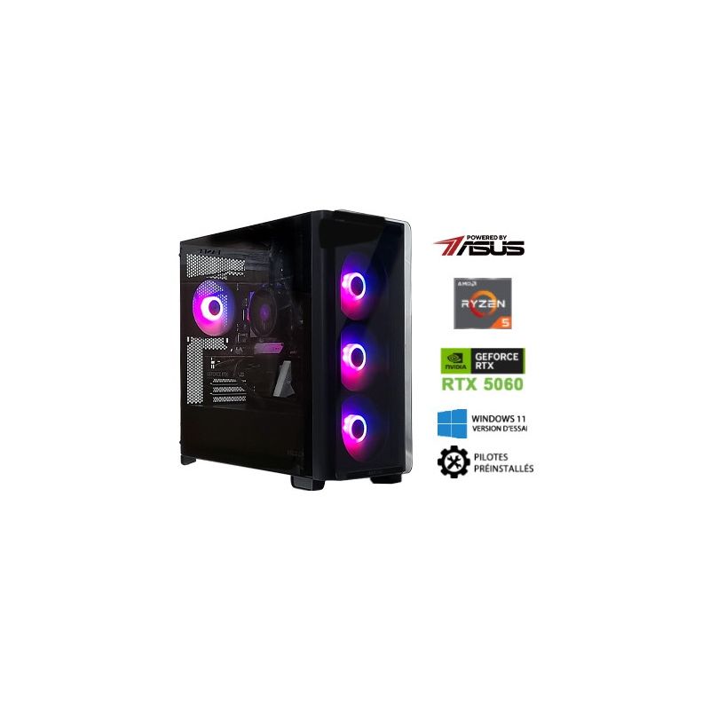 Ryzen5 7500F - B650M - RTX5060 8Go - VENGEANCE DDR5 16Go - SSD 1To - USB Type-C en facade - LAN 2.5 GbE - 750W - Windows 11 en version d'essai avec ses pilotes preinstalles.
