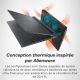Une conception thermique avancée, inspirée d’Alienware, dotée de quatre caloducs et de ventilateurs améliorés comportant des lames ultrafines accroît la zone d’échange de chaleur.