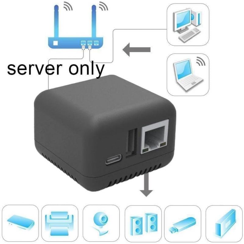 Design simple et compact, faible consommation, peu encombrant, facile à transporter. Prise en charge de l'impression d'images et de texte, équipé d'un port LAN RJ-45 10/100 Mbps. Connexion d'imprimante USB 2.0 haute vitesse, prend en charge plusieurs utilisateurs partageant simultanément une imprimante et un réseau sans fil. Support pour personnaliser la fonction de stockage de carte SD, prend en charge jusqu'à 256 Go. Plus de 95% d'imprimantes USB de marque sur le marché. Caractéristiques : Fonction WiFi : conforme aux réseaux sans fil 802.11b/g/n Prise en charge des imprimantes : prend en charge les imprimantes avec port USB 2.0 standard Système d'exploitation: Linux 3.4 Interface : hôte USB2.0+périphérique USB2.0+Enternet Extension de carte : prend en charge jusqu'à 256 Go Version BT : BT 4.0. Tension d'alimentation : 5 V. Système de travail pris en charge : Windows XP ou supérieur, Android et iOS. Paramètres matériels: ARM 9 300MHz/128MB Flash/BT 4.0 Matériau : ABS. Dimensions approximatives : 5,3 x 4 cm. Couleur : gris. Remarques : Les mesures étant prises à la main, les tailles indiquées peuvent varier de 0 à 1 Merci de ne commander que si vous acceptez cette marge d'erreur. La couleur de l'article peut varier de celle de la photo en fonction des paramètres d'affichage et de luminosité de votre Merci ! Contenu : 1 serveur d'impression sans fil