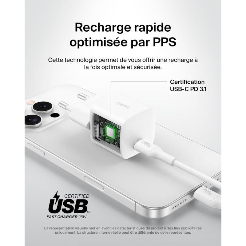 Chargez rapidement et en toute sécurité votre appareil compatible avec le chargeur mural USB-C 20W, puissant et prêt à voyager. Un câble USB-C avec connecteur Lightning est inclus. Ce chargeur mural compact de 20 watts avec USB-Power Delivery signifie une charge rapide pour vos appareils compatibles USB-PD. La technologie PPS détecte l'appareil connecté et négocie la bonne quantité d'énergie nécessaire pour une charge idéale. Conçu pour être facile à transporter, ce chargeur de poche s'adapte facilement à tous les environnements, que ce soit à la maison ou en déplacement. Chargez votre iPhone dès sa sortie de l'emballage grâce au câble fourni. | |