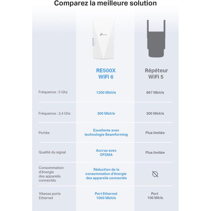 | Contenu de l'emballage | Guide d'installation rapide du répéteur Wi-Fi RE500X |